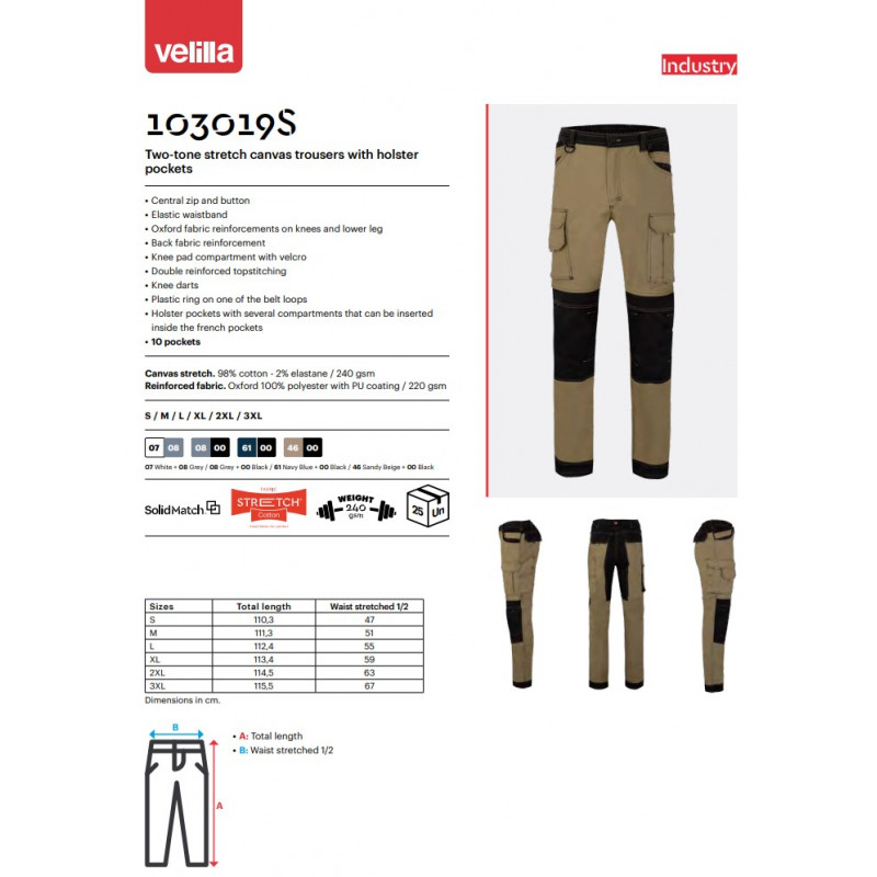 Spāņu firmas Velilla elastīgas izturīga audekla darba bikses 103019S tumši zilas/melnas, L izmērs