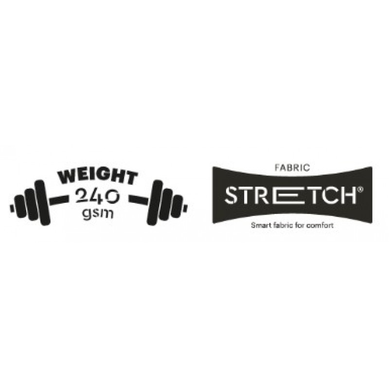 Sastāvs: elastīgs audums. 46% kokvilna – 38% EME (elastomultiesters) – 16% poliesters / 240 g/m²