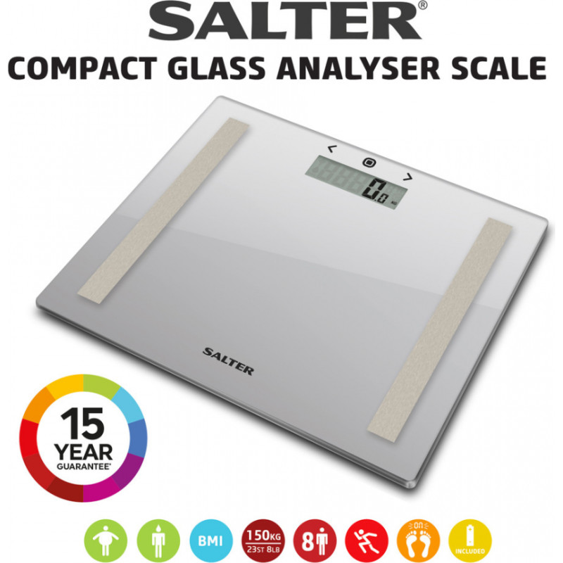 Jūsu iepirkumu grozs ir tukšs! Salter 9113 SV3RAREU16 Compact Glass Analyser Bathroom Scales - Silver