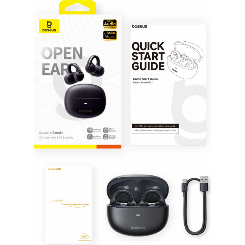 IEZĪMES - Atvērtas ausu aizdares konstrukcija: Atvērtās auss aizdares konstrukcija nodrošina drošu un ērtu klausīšanās pieredzi. Baseus Bowie MC1 atvērtās ausu austiņas vienkārši viegli piestiprina pie ausīm un lieliski sader ar brillēm un citiem piederumiem. Inovatīvās atvērtās ausu austiņas ļauj jums saglabāt izpratni par apkārtējo vidi, kas ir ideāli piemērots tādiem pilsētas piedzīvojumiem kā skriešana, riteņbraukšana vai pastaigas. Dzirdiet gan mūziku, gan apkārtējo pasauli! - Pielāgojams komforts ar aizsardzību pret nokrišanu: Bowie MC1 klipsa austiņas ir izstrādātas, lai nodrošinātu maksimālu komfortu. Baseus" pašu izstrādātais Cloud AirCushion dizains nodrošina mākoņaini mīkstu komfortu, vienlaikus droši iekļaujoties ausīs, palielinot stabilitāti par 198 % un komfortu par 200 %. Četru atbalsta punktu konstrukcija nodrošina stabilitāti pret nokrišanu, bez raizēm veicot dažādus vingrinājumus un kustības. Elastīga C-Bridge konstrukcija pielāgojas dažādām ausu formām. 5,2 g viegla konstrukcija nodrošina ilgstošu un ērtu valkāšanu. - Ietekmīga skaņa ar aizsardzību pret noplūdi: Bowie MC1 atvērto ausu austiņām ir inovatīva 3 magnētu konstrukcija un 0,8 mm lielāka amplitūda, kas uzlabo pilnas skaņas skaidrību un skaņas laukuma platumu. AI adaptīvā basa pastiprināšana dinamiski kompensē basus un palielina zemo frekvenču detaļas. Virziena skaņas tehnoloģija samazina skaņas noplūdi un nodrošina privātu klausīšanās pieredzi. - IP57 ūdensizturība un putekļu izturība: Bowie MC1 austiņas ar atvērtām ausīm ir veidotas tā, lai izturētu dabas stihijas, un tām ir IP57 ūdensizturības un putekļu necaurlaidības kategorija. Neatkarīgi no tā, vai esat nokļuvis lietū vai svīst sporta zālē, jūsu austiņas ir drošas un darbojas pēc iespējas labāk. - Adaptīvā balss uztveršana: Bowie MC1 atvērtās austiņas ar Baseus DNN adaptīvās trokšņu samazināšanas algoritmu un 2 trokšņu slāpēšanas mikrofoniem novērš vēja troksni, braucot ar velosipēdu, vai jebkuru citu troksni un precīzi uztver jūsu balsi, nodrošinot, ka esat skaidri dzirdams jebkurā laikā un jebkurā vietā. - Pielāgojama pogu vadība: Lai novērstu nepareizu piespiešanu, fiziski izjūtiet pogas vadību. Izbaudiet vieglu vadību, kas ir jūsu rokai pa rokai. Varat arī lejupielādēt lietojumprogrammu Baseus, lai pielāgotu pogu vadību. SPECIFIKĀCIJAS Bluetooth versija: 5.4 Sakaru diapazons: 10 m atklātā vidē Akumulatora ietilpība: 48mAh/0,185Wh (austiņas), 600mAh/2,22Wh (uzlādes korpuss). Ieeja: 5V⎓1A Output: 3,8-5V⎓240mA (120mA uz katru portu) Frekvenču diapazons: 20Hz-20KHz Bezvadu frekvenču josla: 2400MHz-2483,5MHz Uzlādes ports: C tipa Savietojamība: Iebūvējams: USB ports, USB ports, USB ports, USB ports, USB ports, USB ports, USB ports, USB ports, USB ports: Bluetooth atbalstošas atskaņošanas ierīces                    Apraksts tiek tulkots, izmantojot automātiskās tulkošanas rīku. Ja pamanāt kādas neatbilstības, lūdzu, paziņojiet mums rakstot uz e-pastu apraksti@lemona.lv.
