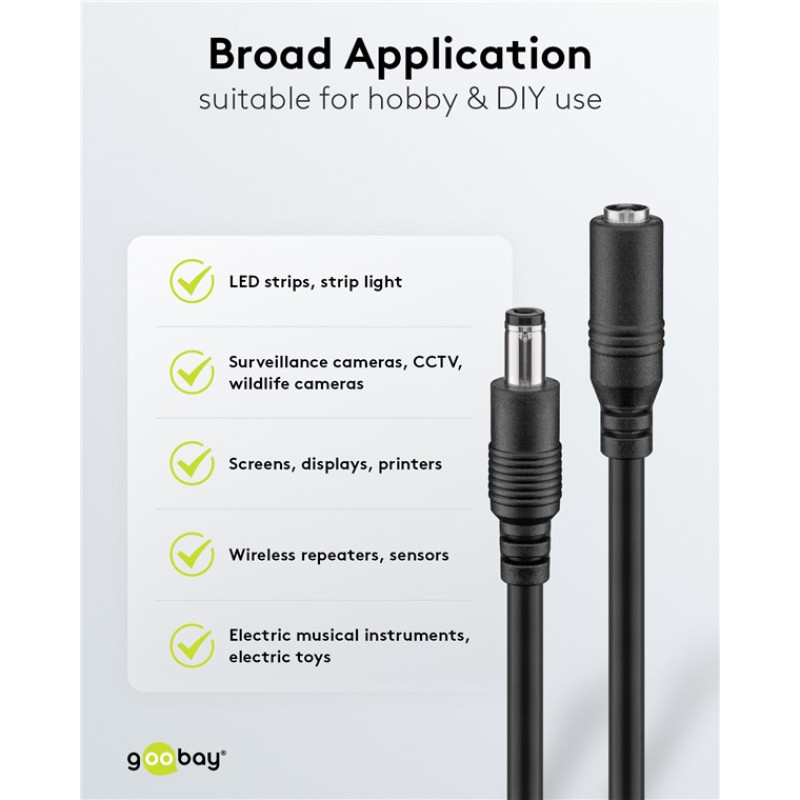 Goobay Līdzstrāvas pagarinājuma kabelis, 1,5 m, 5,5x2,5 mm, melns, 2x0,5 mm², maks. 24 V līdzstrāvas 140 W